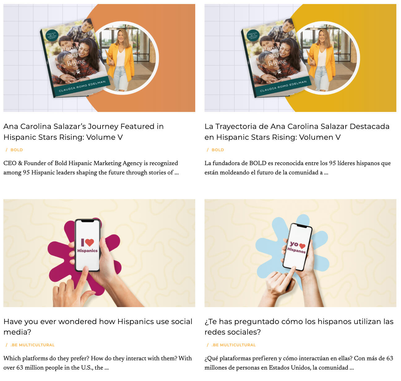Mi carrera en marketing digital comienza en BOLD, una agencia especializada en el mercado hispano. Inicié como editora de contenido en español, luego avancé a copywriter y creadora de contenido. Tras tres años y medio, asumí el rol de Brand Manager, liderando estrategias de marca y campañas dirigidas a la audiencia hispana.
