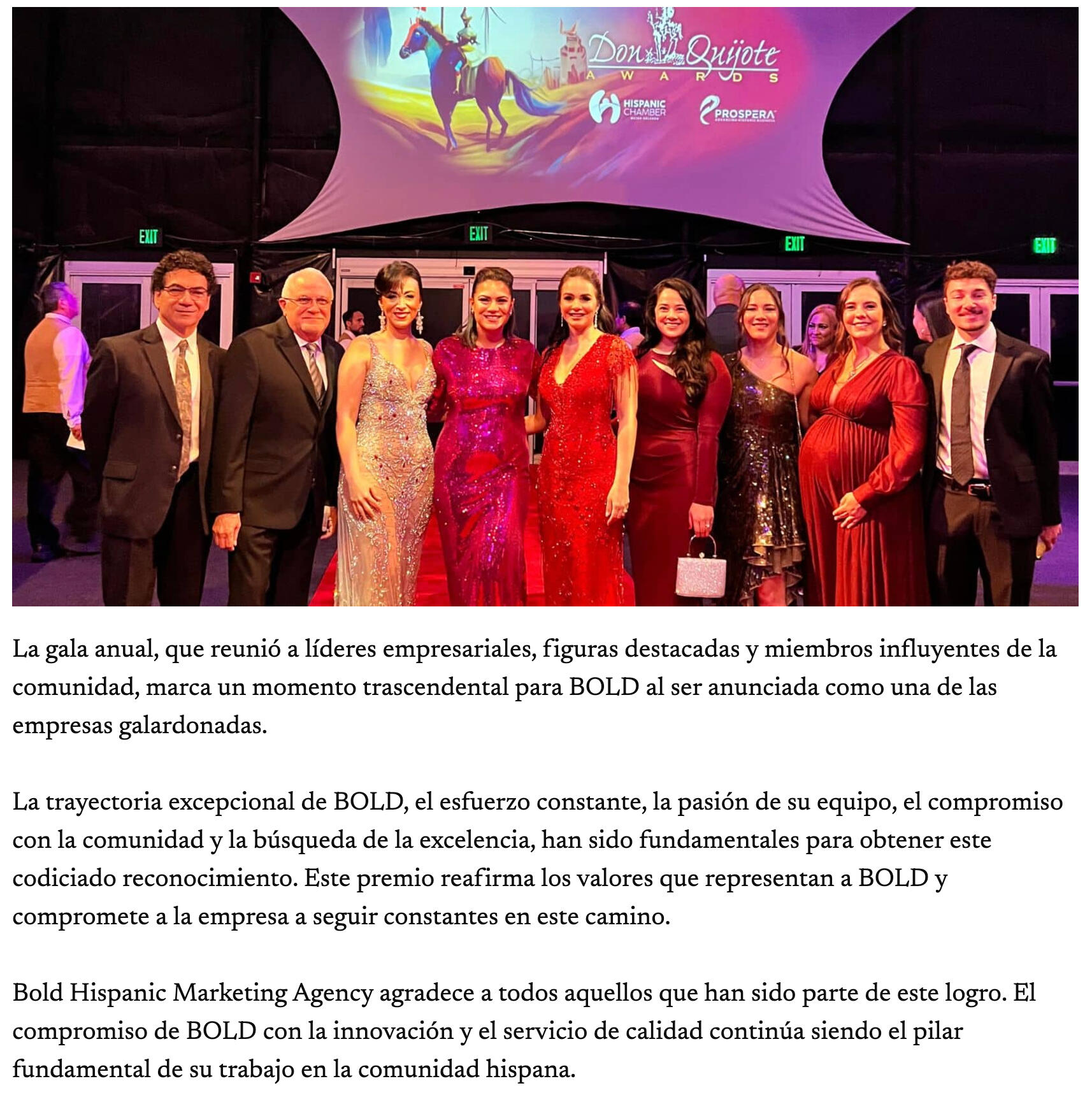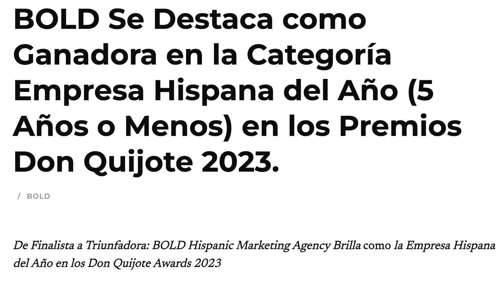 En esta nota de prensa, anuncio que BOLD ha sido reconocida como la Empresa Hispana del Año en la categoría de 5 años o menos durante los Premios Don Quijote 2023. Detallo el significado de este galardón para nuestra empresa y cómo refleja nuestro compromiso con la comunidad hispana. La nota incluye citas de miembros clave del equipo y destaca nuestras iniciativas más recientes que han contribuido a este logro.